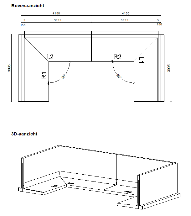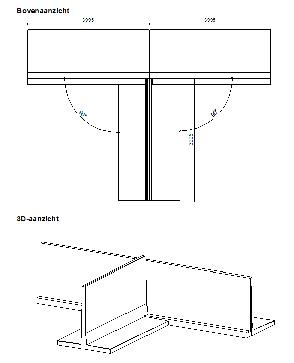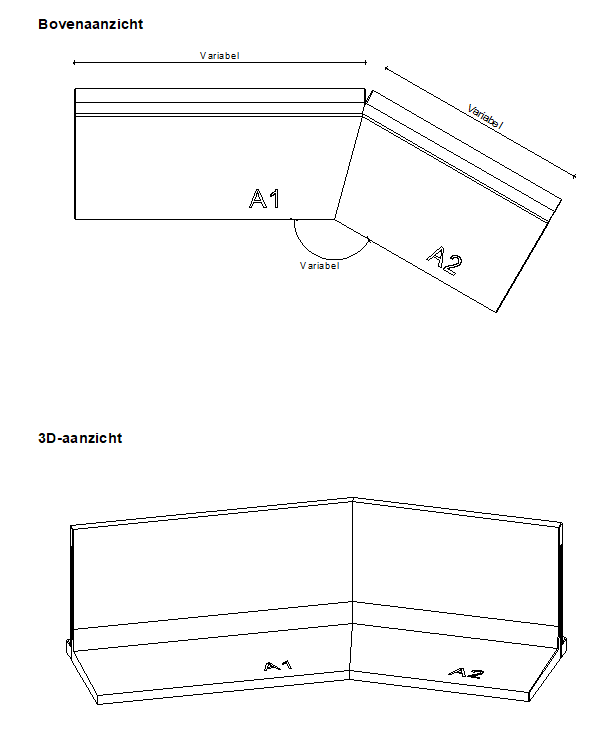 Voor al onze keerwandtypen is een standaard 90 graden hoekoplossing beschikbaar. Bij een afwijkende hoek kan een hoekoplossing op maat worden gerealiseerd.