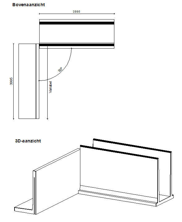 Voor al onze keerwandtypen is een standaard 90 graden hoekoplossing beschikbaar. Bij een afwijkende hoek kan een hoekoplossing op maat worden gerealiseerd.