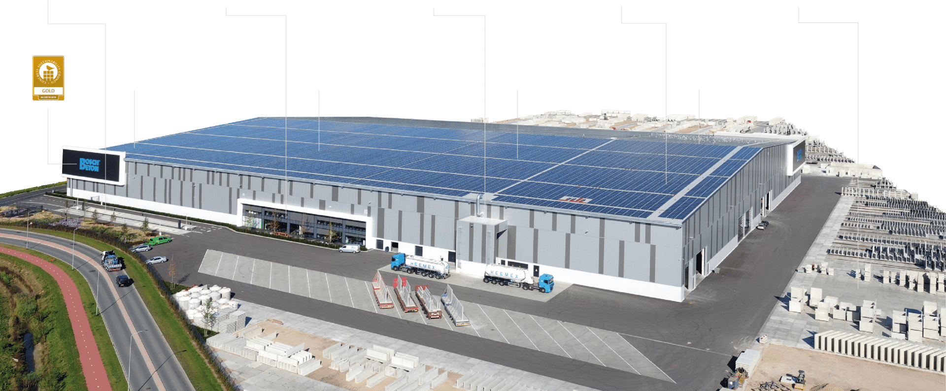 Vores tiptopmoderne fabrik afspejler vores vision og mission for bæredygtighed. Bæredygtigheden af et produkt står og falder med en bæredygtig produktionsproces. Bygningen er derfor udformet omkring produktionsprocessen, så denne i teknisk henseende fungerer så effektivt og bæredygtigt som muligt. I designfasen er der taget højde for, hvad fabrikken skal blive til i sit næste liv skal være. Efter endt levetid kan bygningen således demonteres og genanvendes fuldt ud. Hollands første bæredygtige betonfabrik er opført i henhold til BREEAM-NL Outstanding (Building Research Establishment Environmental Assessment Method).